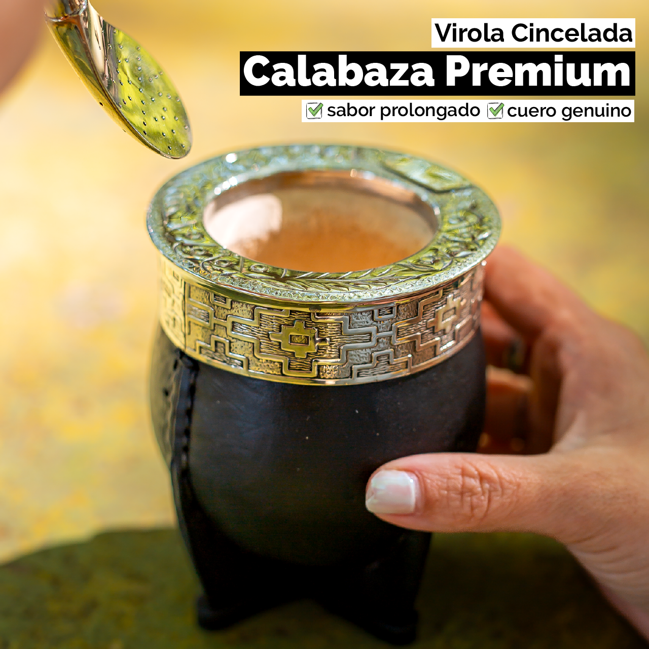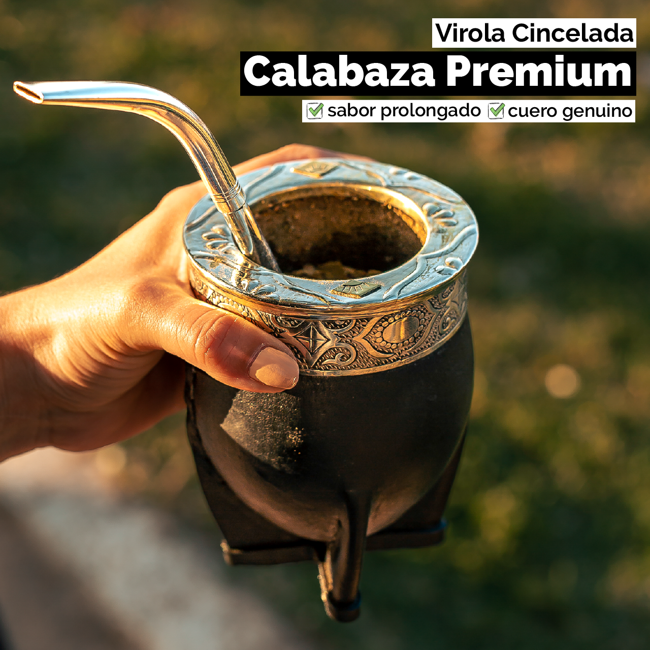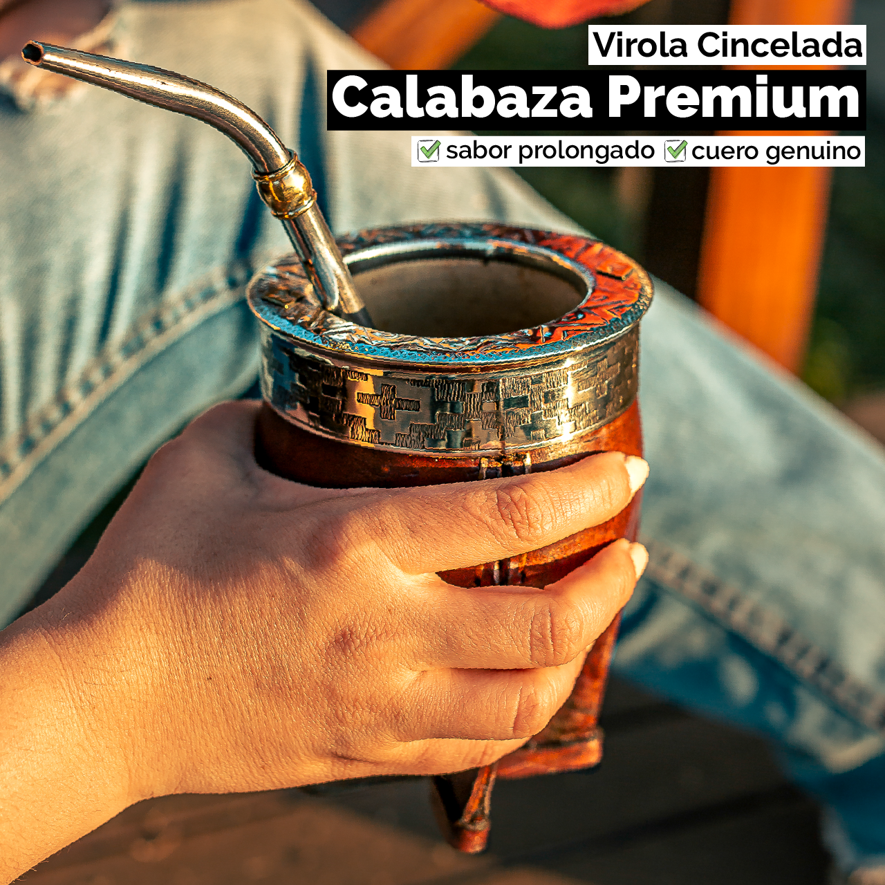 🧉 Mate Imperial de Calabaza, con fleje/guarda y virola cincelada, íntegramente en alpaca, forrados en cuero de primera calidad.